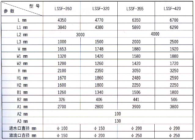 螺旋式砂水分離機由無軸螺旋、襯條、U形槽、水箱,導(dǎo)流板和驅(qū)動裝置等組成。當(dāng)砂水混合液從分離器的一端項部輸入水箱,混合液中較大的如砂粒等將沉積于U形槽底部,在螺旋的推坳下,砂粒沿斜置的U形槽底提升,離開液面后繼續(xù)推移一段距離,在砂粒充分脫水后經(jīng)排砂口卸置砂桶,而與砂分離后的水則從溢流口排出并送往廠內(nèi)進水池。